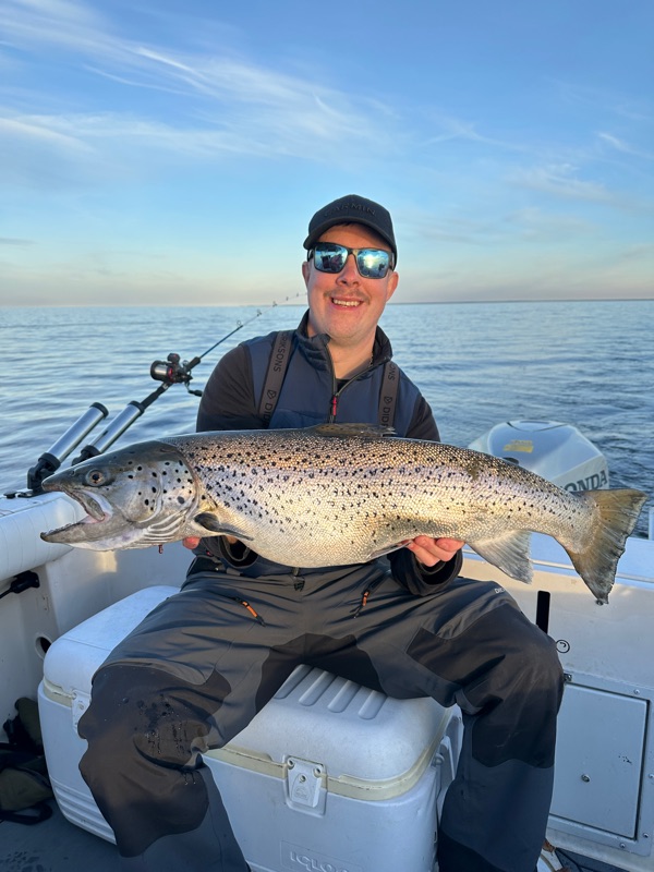 kör vidare å svänger runt, då löser djupriggsspöt ut. Jag ser fisken går upp och hoppar i ytan å tycker att det är en okej öring 😁