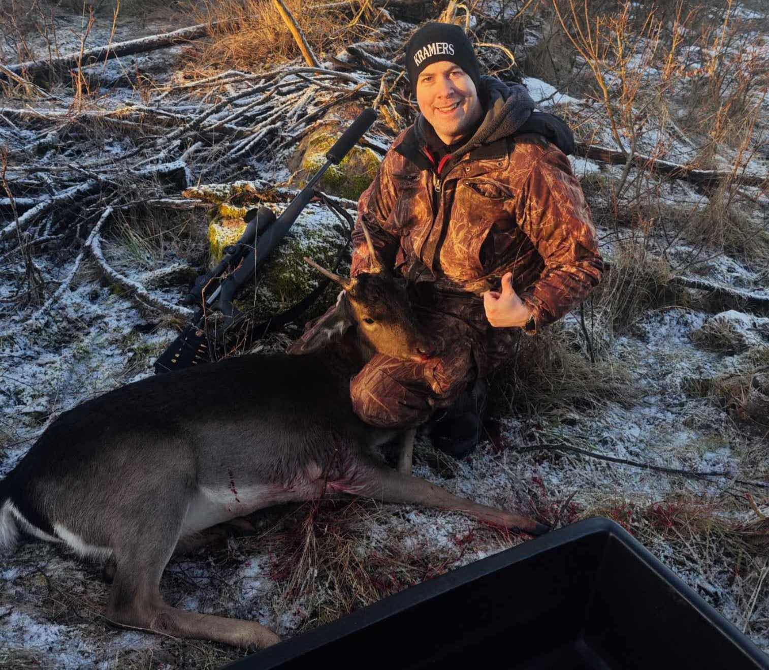 Vi hade flyt då granngobben lyckades skrämma 6 hjortar åt mitt håll och jag lyckades fälla en liten spets på 62kg