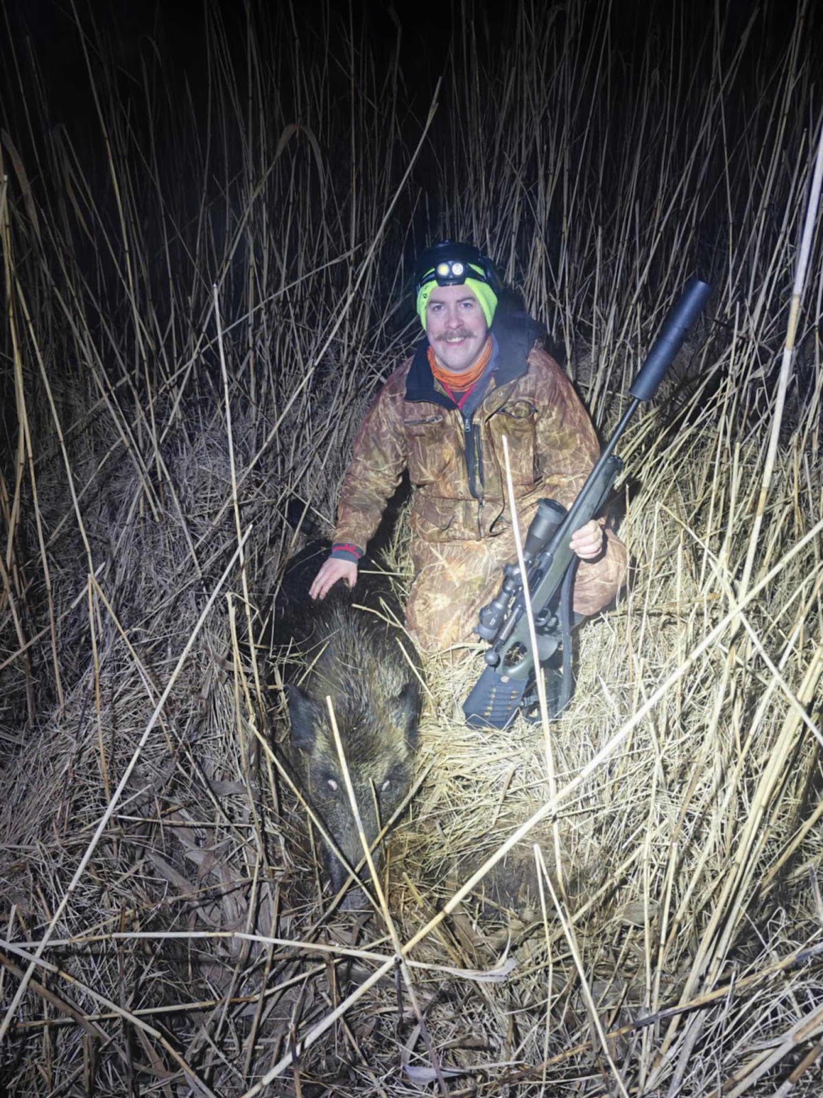 Efter ett dåligt skott långt bak så lyckades vi spåra blodet fram till grisen som hade gått ut i vassen. Där kunde vi avsluta och forsla hem grisen. Men det blev en sen söndagskväll och var hemma vid 01 😅