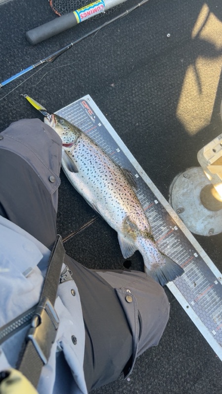 kör vidare å svänger runt, då löser djupriggsspöt ut. Jag ser fisken går upp och hoppar i ytan å tycker att det är en okej öring 😁